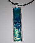 Fluid Art pendant made from run off paint from the Wild Atlantic art series. It is mounted in a silver plated rectangle pendant which hangs on a black wax cord and presented in a black box
