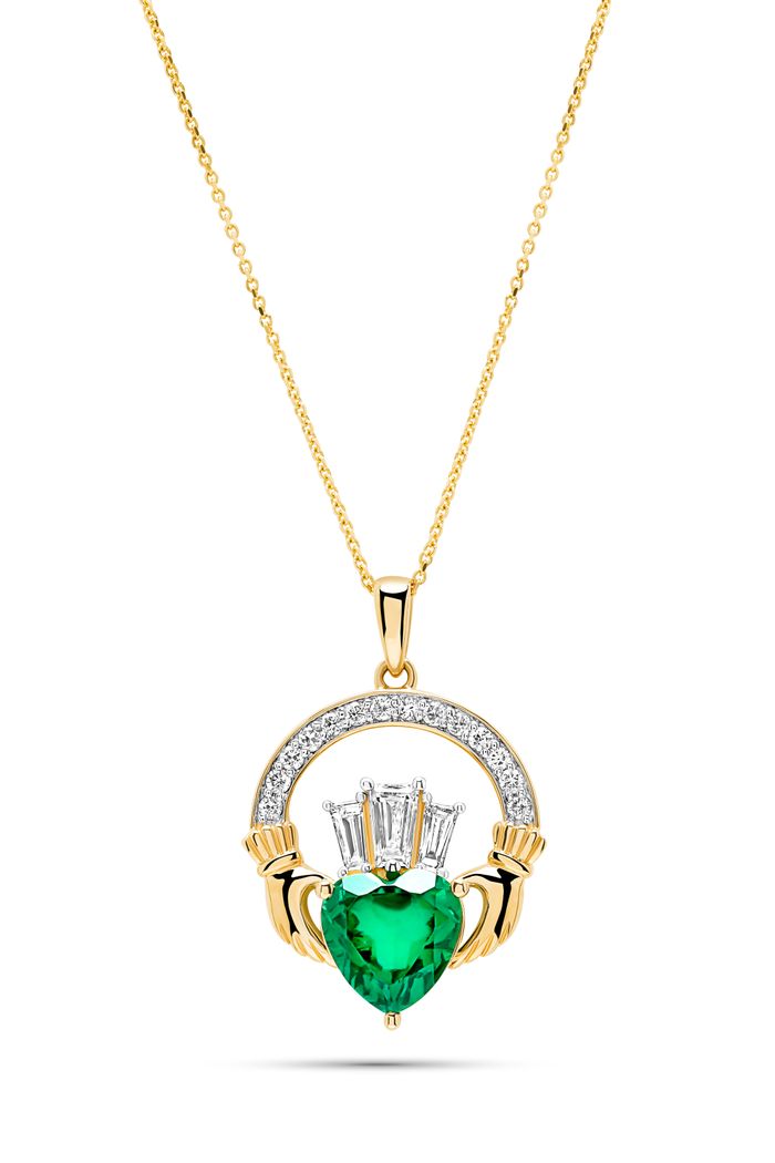 14kt Gold Lab emerald and Diamond Claddagh Necklace