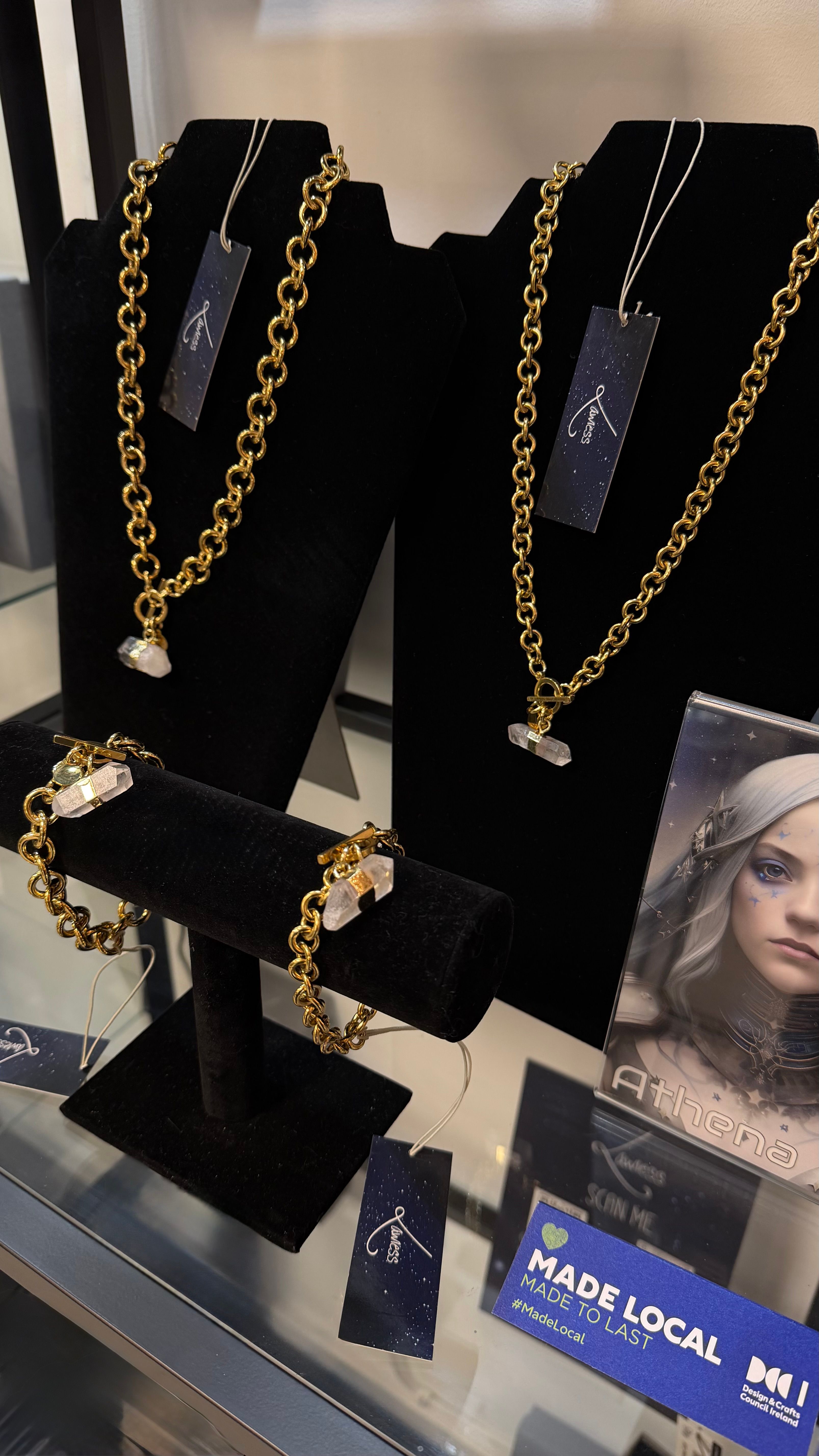 Quartz crystal sits at the centre of the collection, chosen for its ability to amplify focus and sharpen resolve. Forms are structured and confident, designed to sit close to the body and hold their ground.