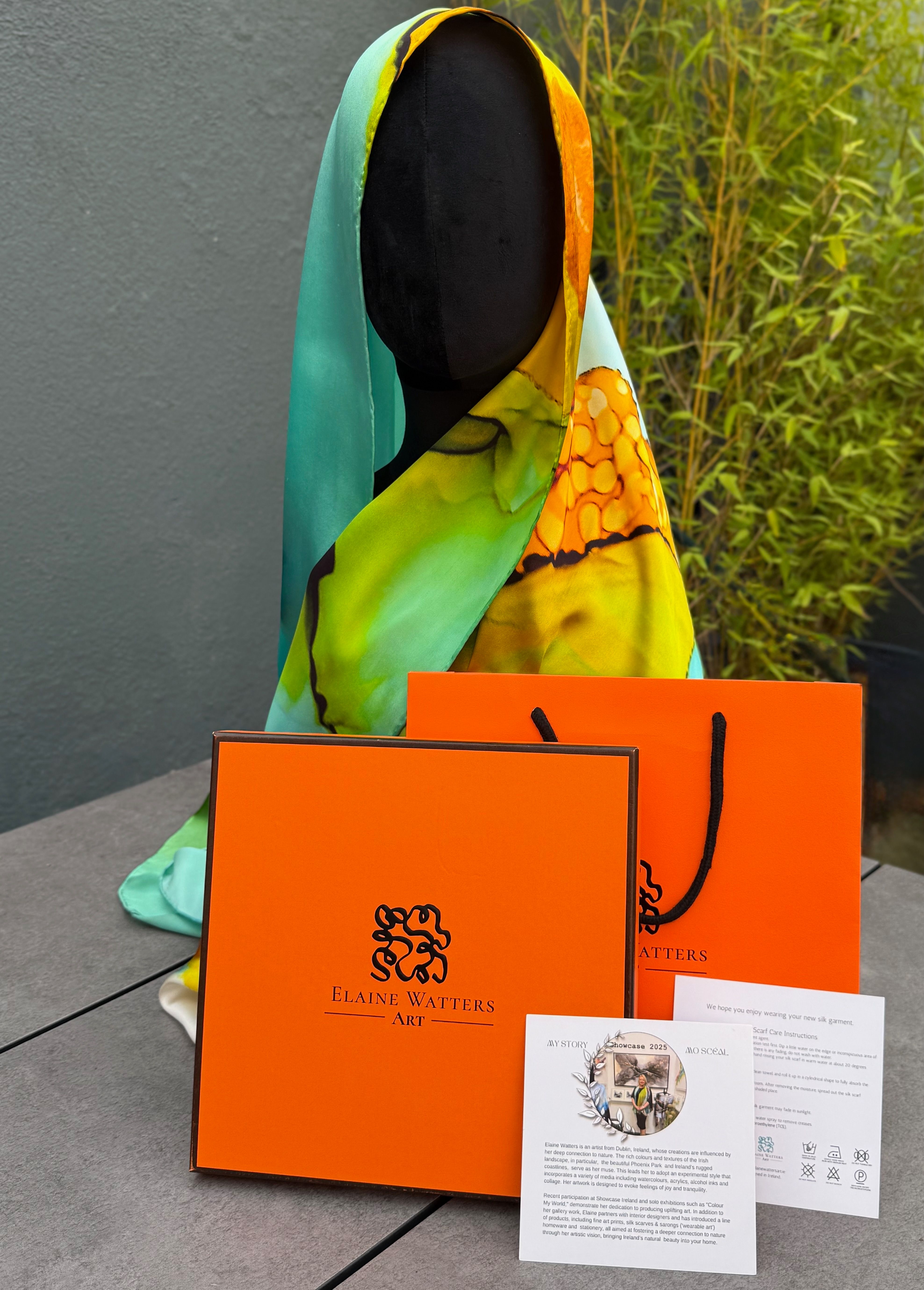 Experience the luxurious feel of this 14mm 100% silk scarf, thoughtfully crafted with hand-sewn details to enhance its elegance. Measuring a generous 180cm by 65cm with hand sewn details, it offers ample room for stylish draping and layering, making it a versatile addition to any wardrobe. Designed and packaged in Ireland, this exclusive piece draws inspiration from the stunning Irish coastline and shimmering summer waters, capturing the essence of natural beauty and tranquility. Elevate your style with a scarf that not only stands out but also tells a story—embrace timeless sophistication and bring a touch of Ireland’s serene charm to your everyday look.