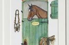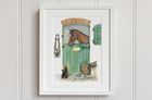 A nostalgic Irish horse and stable watercolour print scene. Featuring a Bay horse, saddle, bridle, and jack russell dog. Illustrated with love in Ireland by artist Tanya. An Irish equestrian scene.