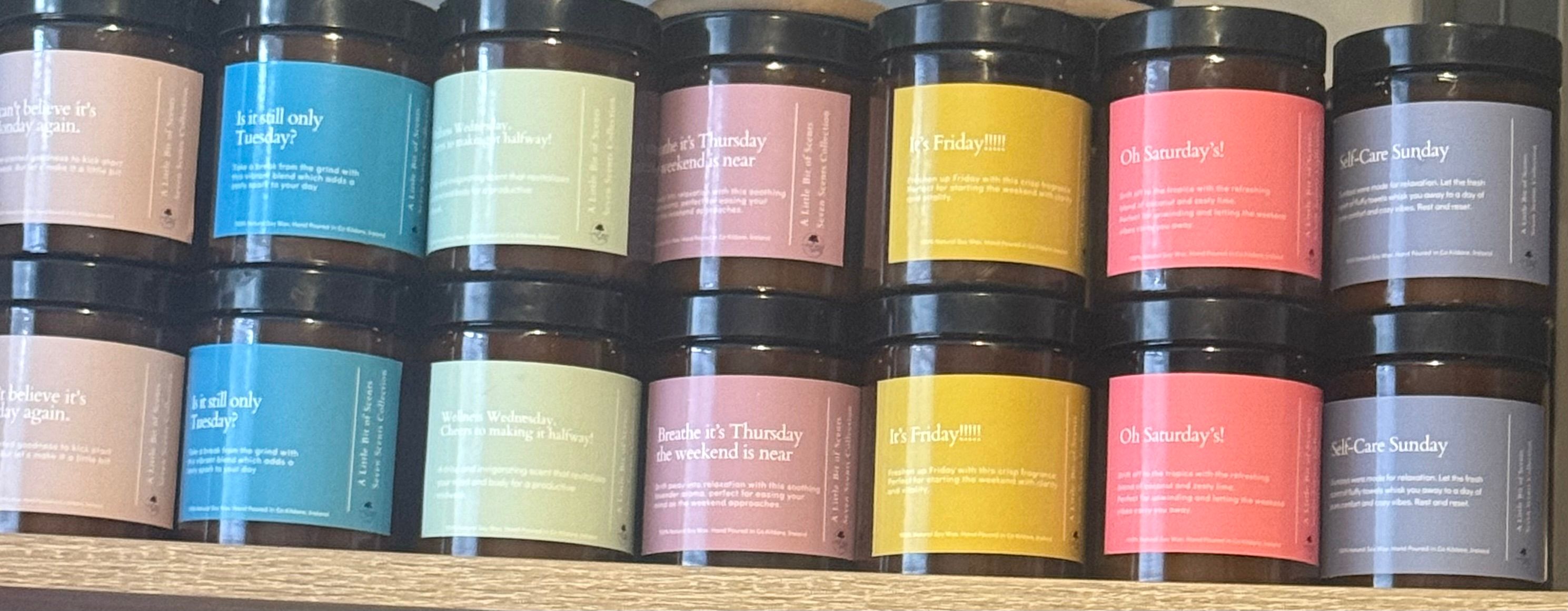 Seven days, seven scents to get you through the week from our rich Irish Coffee to wake you up on Monday, to Cucumber & Mint to help you hero Wellness Wednesday. Seven scents, seven moods each hand-poured with 100% natural soy wax for a clean, comforting burn every day of the week.